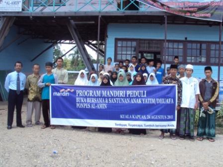 PT BANK MANDIRI CABANG KAPUAS rhomadhon kali ini memberikan bantuan kepada para santri peserta itiQaf pondok pesantren al-amin berupa Buku, pena, serta karpet masjid di samping itu juga PT bank Mandiri cabang kapuas juga memberikan pesangion kepada para santri, terimmakasih mudah_mudahan amal bapk2 sekalian diterima Allah SWT