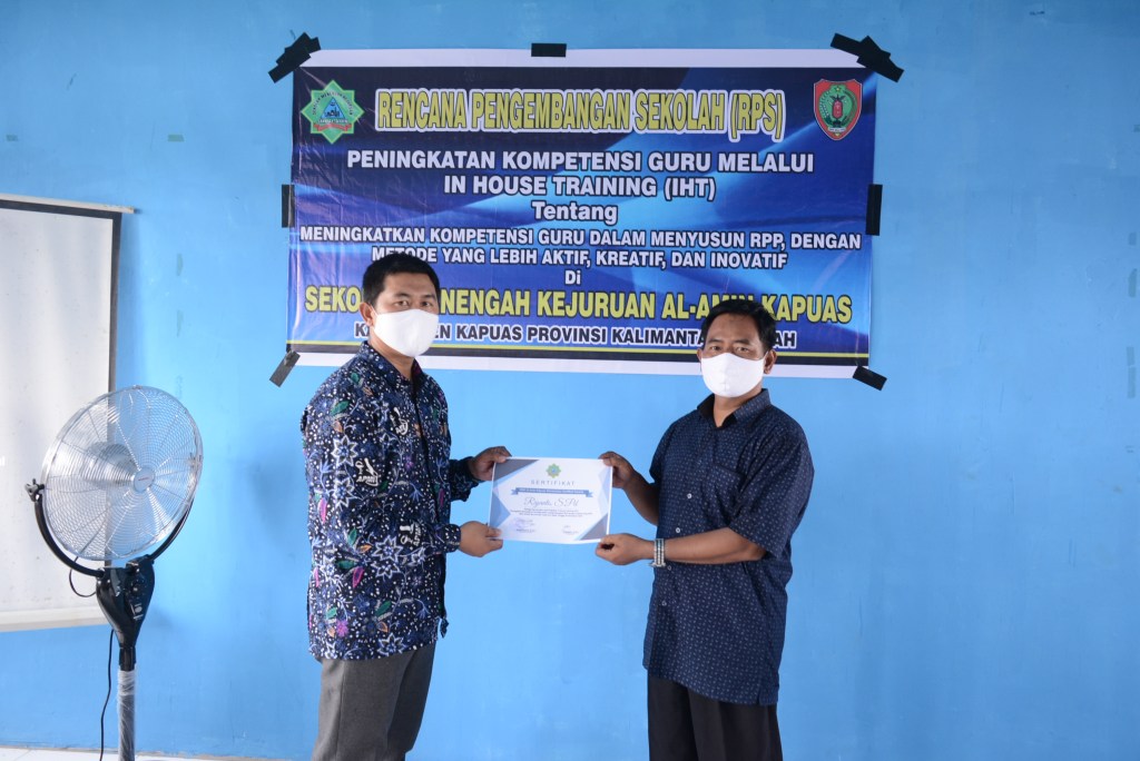 Acara ini menghadirkan pemateri yang sangat mumpuni di bidangnya yaitu bapak riyanto, S.Pd, Guru SMKN 2 Kuala Kapuas. Dalam pemaparannya, bapak Arianto menjelaskan tentang bagaimana menyusun RPP dengan metode yang lebih aktif, kreatif dan inovatif, sehingga para siswa dapat menerima materi pelajaran dengan sangat maksimal. Beliau juga menjelaskan tentang bagaimana agar menyusun RPP ini disesuaikan dengan pembelajaran daring selama pandemi ini. Kegiatan ini diikuti secara antusias oleh para guru baik dari SMK Al Amin maupun dari Madrasah Tsanawiyah Al Amin, dan Madrasah Aliyah Al Amin. Kegiatan yang diadakan pada hari Sabtu 05 Desember 2020 yang bertempat di ruang kelas SMK Al Amin ini di mulai dari jam 09.00 sampai dengan jam 14.00. kegiatan ini ditutup dengan foto bersama, dan penyerahan sertifikat yang diserahkan langsung oleh bapak Supriyanto, S.Pd.I kepala SMK Al Amin kepada bapak Riyanto, S.Pd. Semoga kegiatan ini dapat bermanfaat bagi seluruh guru yang mengikuti kegiatan ini, dan dapat menerapkannya dalam proses pembelajaran.