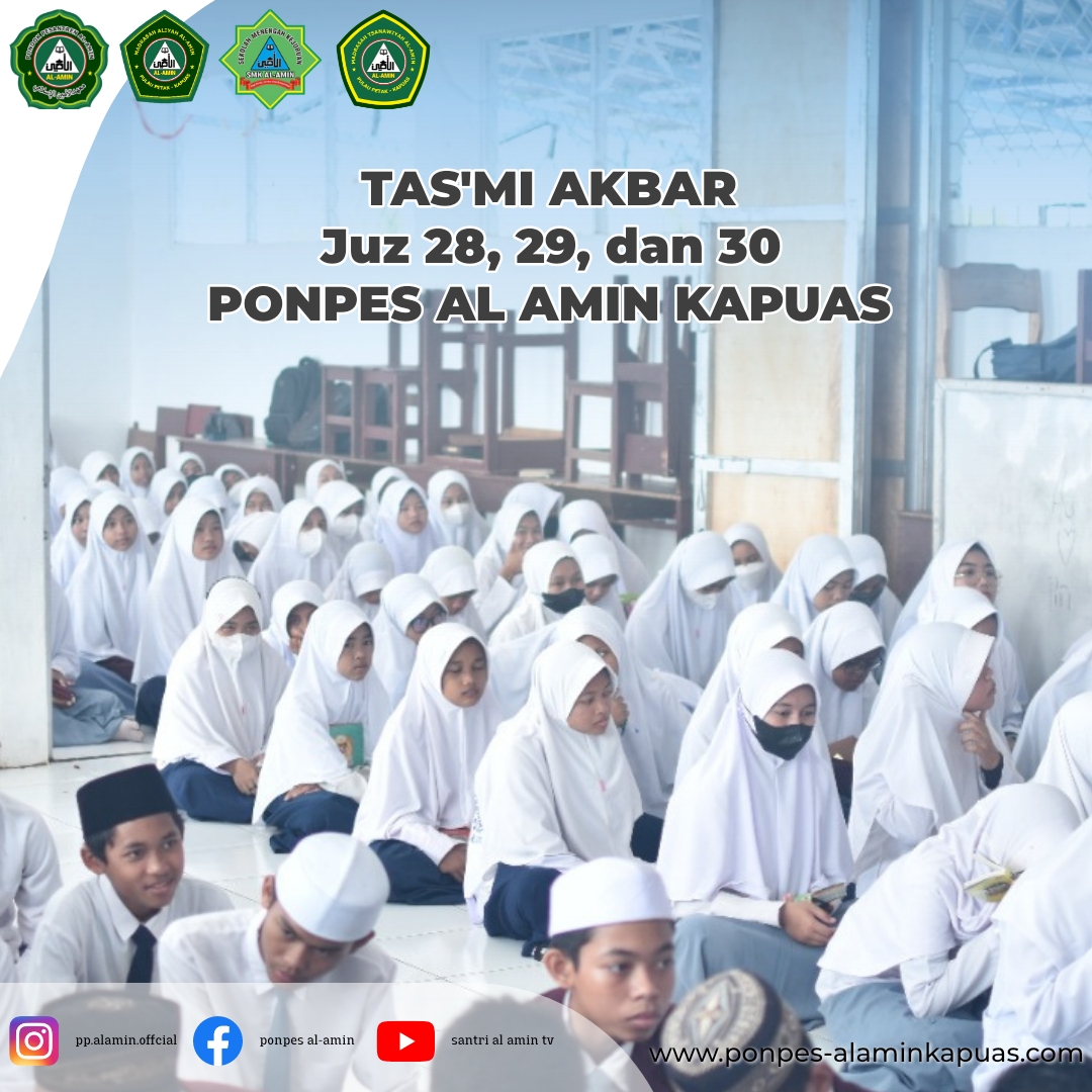 Pondok pesantren (Ponpes) Al-Amin Kapuas adakan tasmi akbar untuk jenjang Madrasah Tsanawiyah (MTs), Madrasah Aliyah (MA), dan Sekolah Menengah Kejuruan (SMK) pada Senin (26/9). Dalam kegiatan tasmi akbar, para santri memperdengarkan hafalan Al-Qur’an di depan para santri lain dan para guru di lingkungan Ponpes Al-Amin Kapuas. Untuk tasmi akbar sendiri, hafalan yang didengarkan adalah Al-Qur’an juz 28, juz 29, dan juz 30. Kegiatan tersebut berjalan khidmat, pasalnya semua santri bersama-sama saling mendengarkan hafalan santri yang lain.