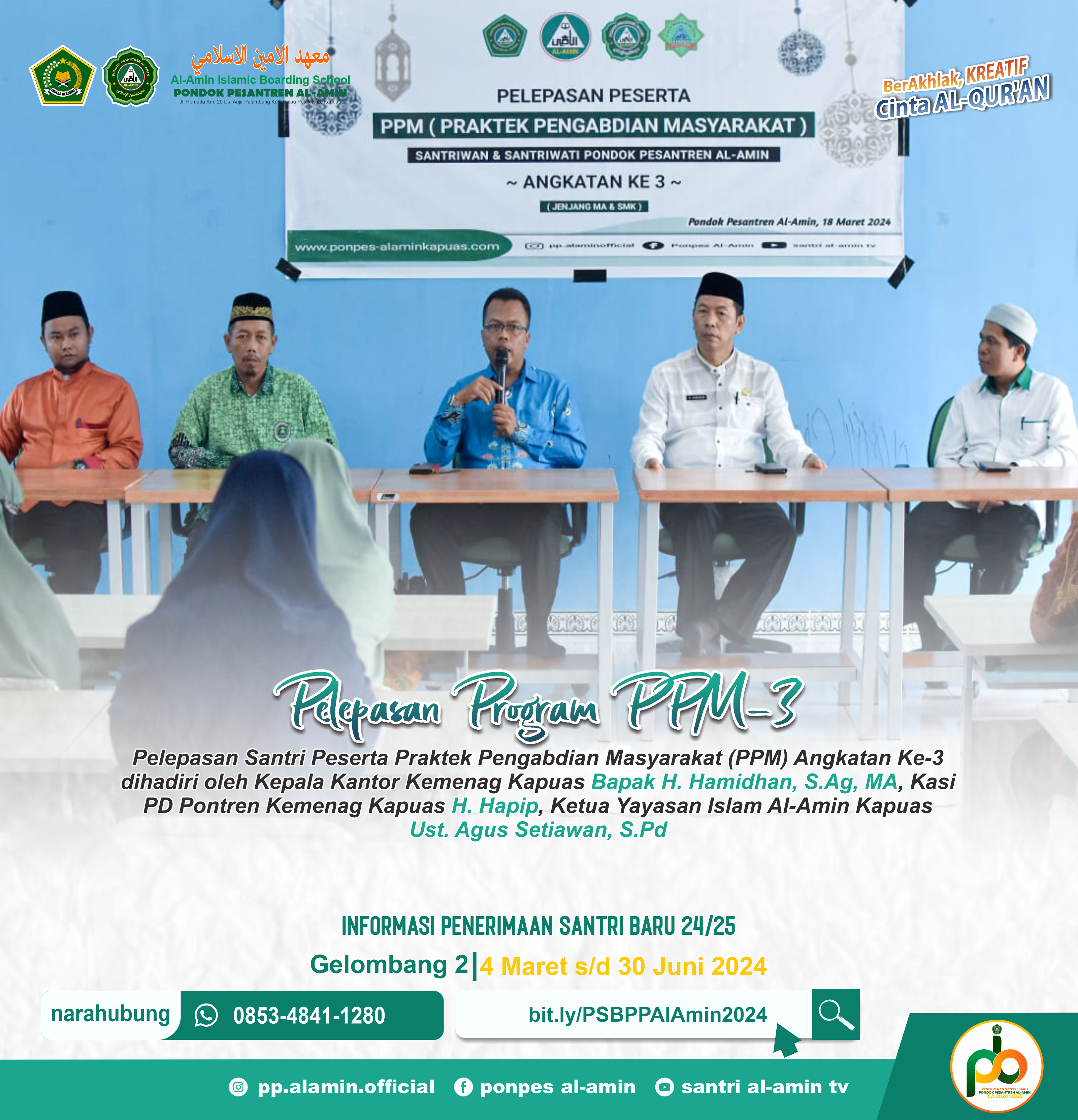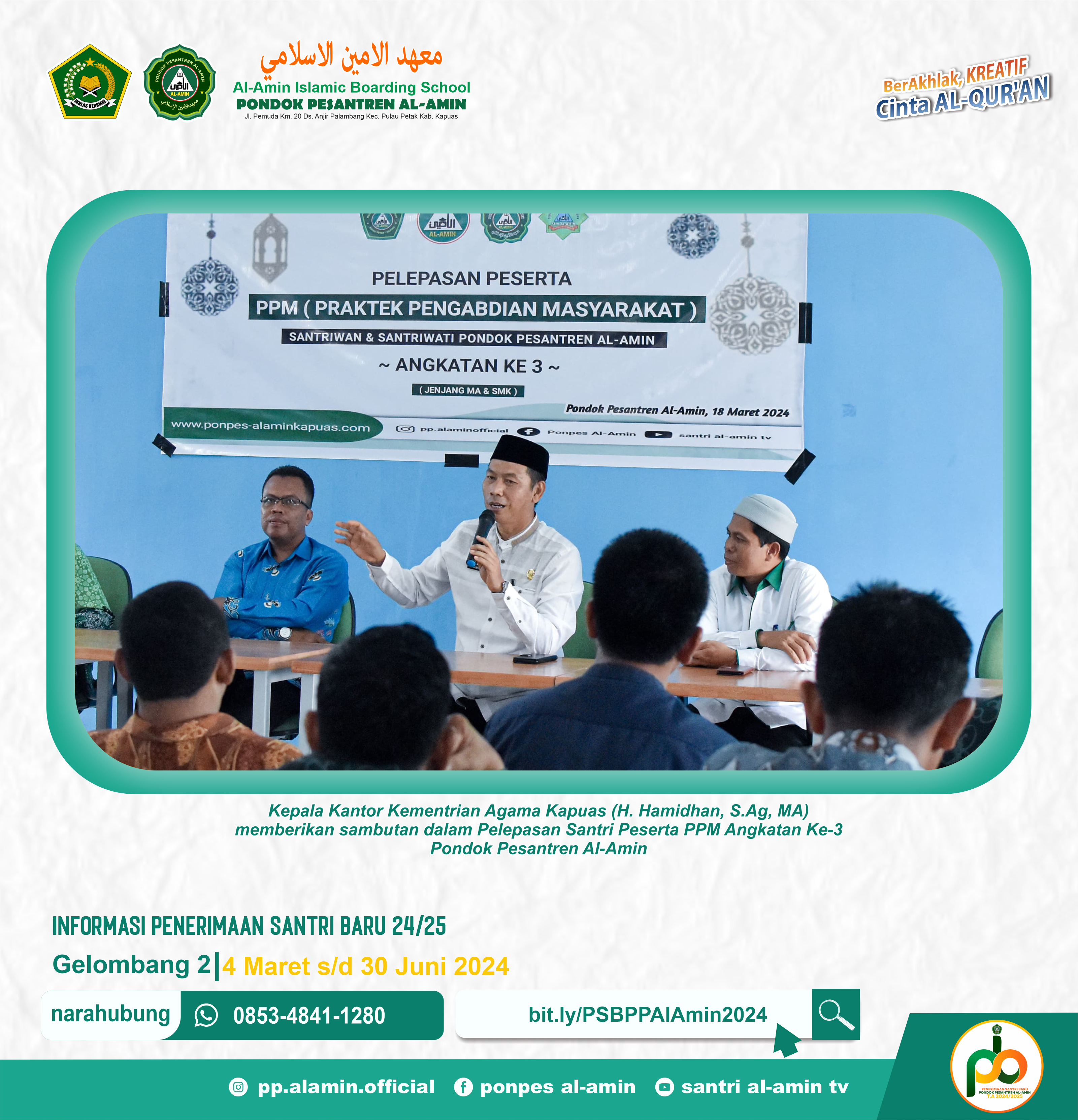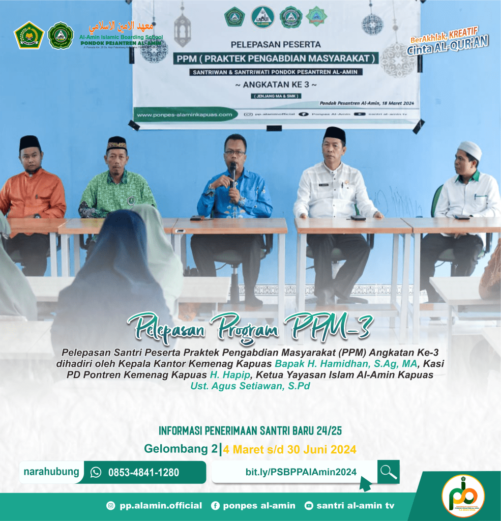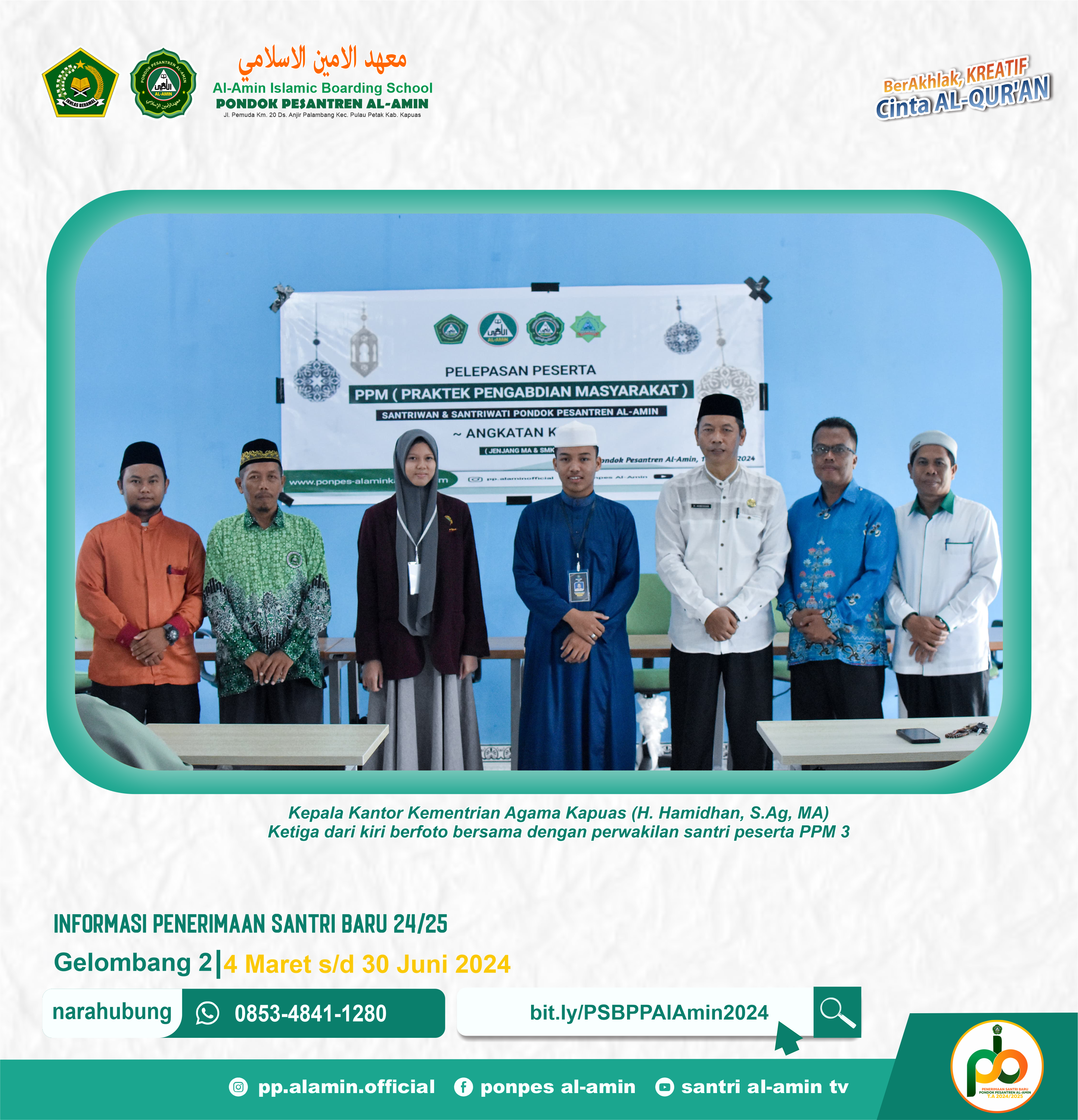 Kapuas, 18 Maret 2024 – Pondok Pesantren Al-Amin menggelar acara pelepasan bagi peserta Praktek Pengabdian Masyarakat (PPM) Angkatan Ke-3, yang dihadiri oleh berbagai pihak penting, termasuk Kepala Kantor Kementerian Agama Kabupaten Kapuas, Bapak H. Hamidhan, S.Ag, MA, Kasi Pendidikan Diniyah dan Pondok Pesantren Bapak H. Hapip, serta Ketua Yayasan Islam Al-Amin Kapuas.